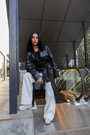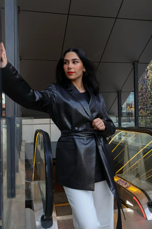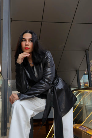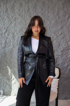 This black evening blazer is crafted from luxurious bridal satin with a soft shine. It’s perfect for weddings, parties, or any night where you want to stand out with confidence. The slim fit and waist belt shape your silhouette beautifully, giving a polished and feminine look.