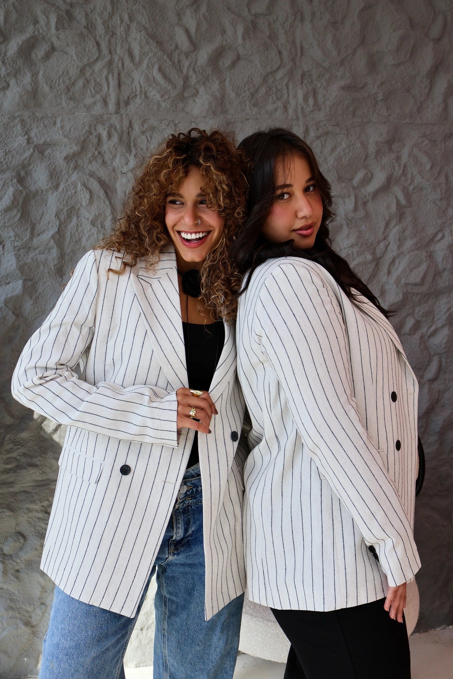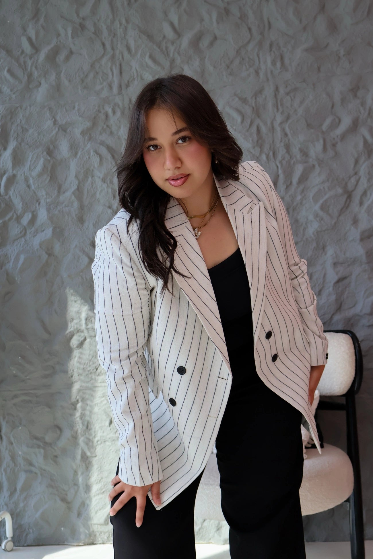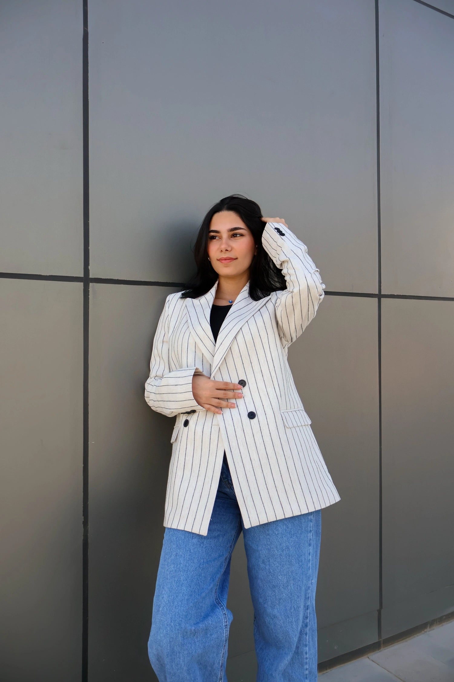 This white blazer with black pinstripes is made from breathable linen and has a relaxed, double-breasted fit. It’s a great choice for spring and summer, perfect for both office wear and smart casual looks. The lightweight fabric and loose cut make it comfortable and stylish all day long.