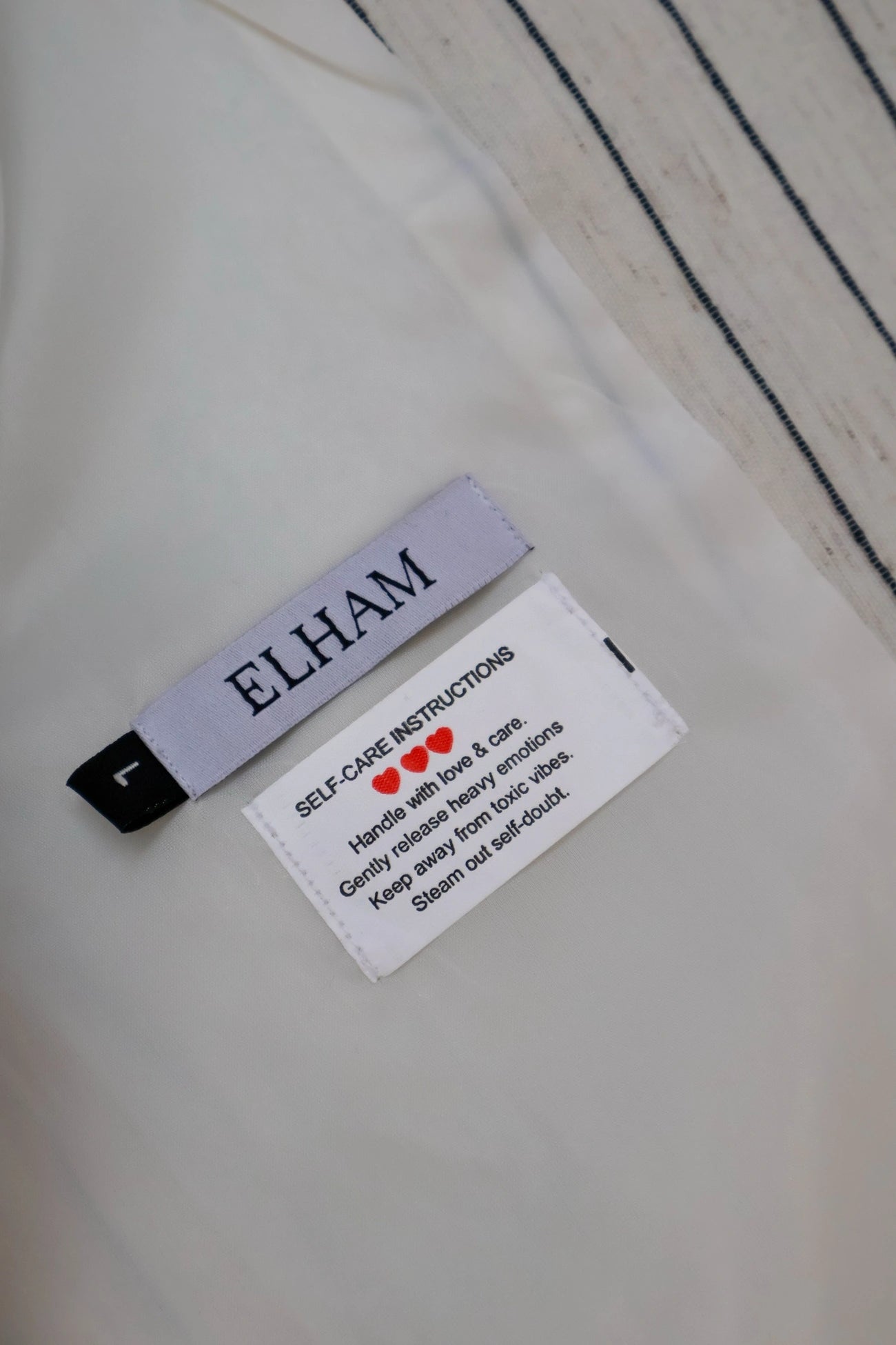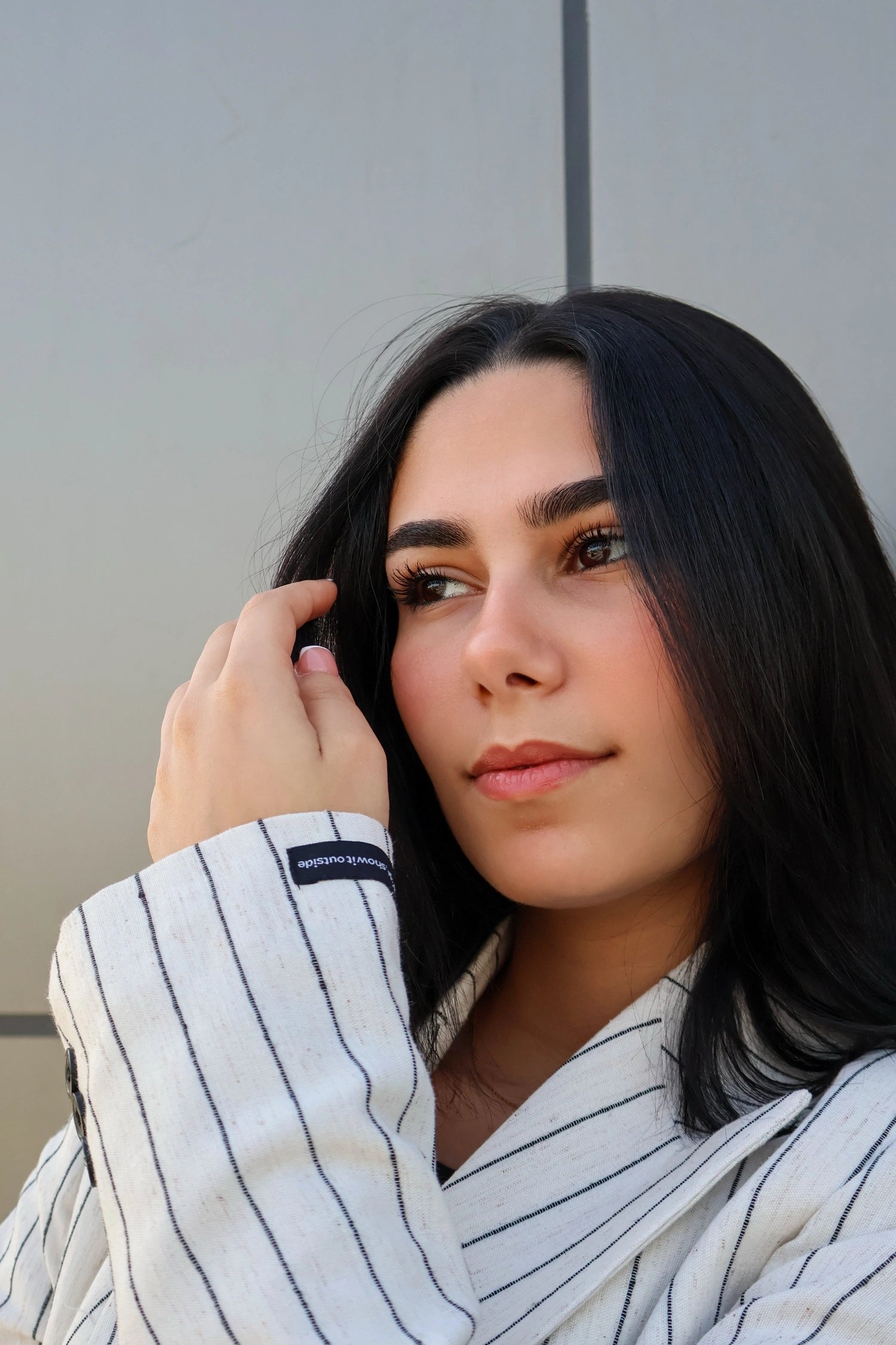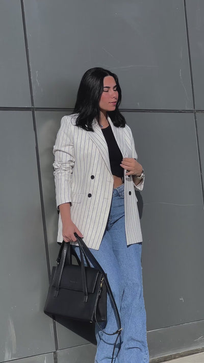 This white blazer with black pinstripes is made from breathable linen and has a relaxed, double-breasted fit. It’s a great choice for spring and summer, perfect for both office wear and smart casual looks. The lightweight fabric and loose cut make it comfortable and stylish all day long.