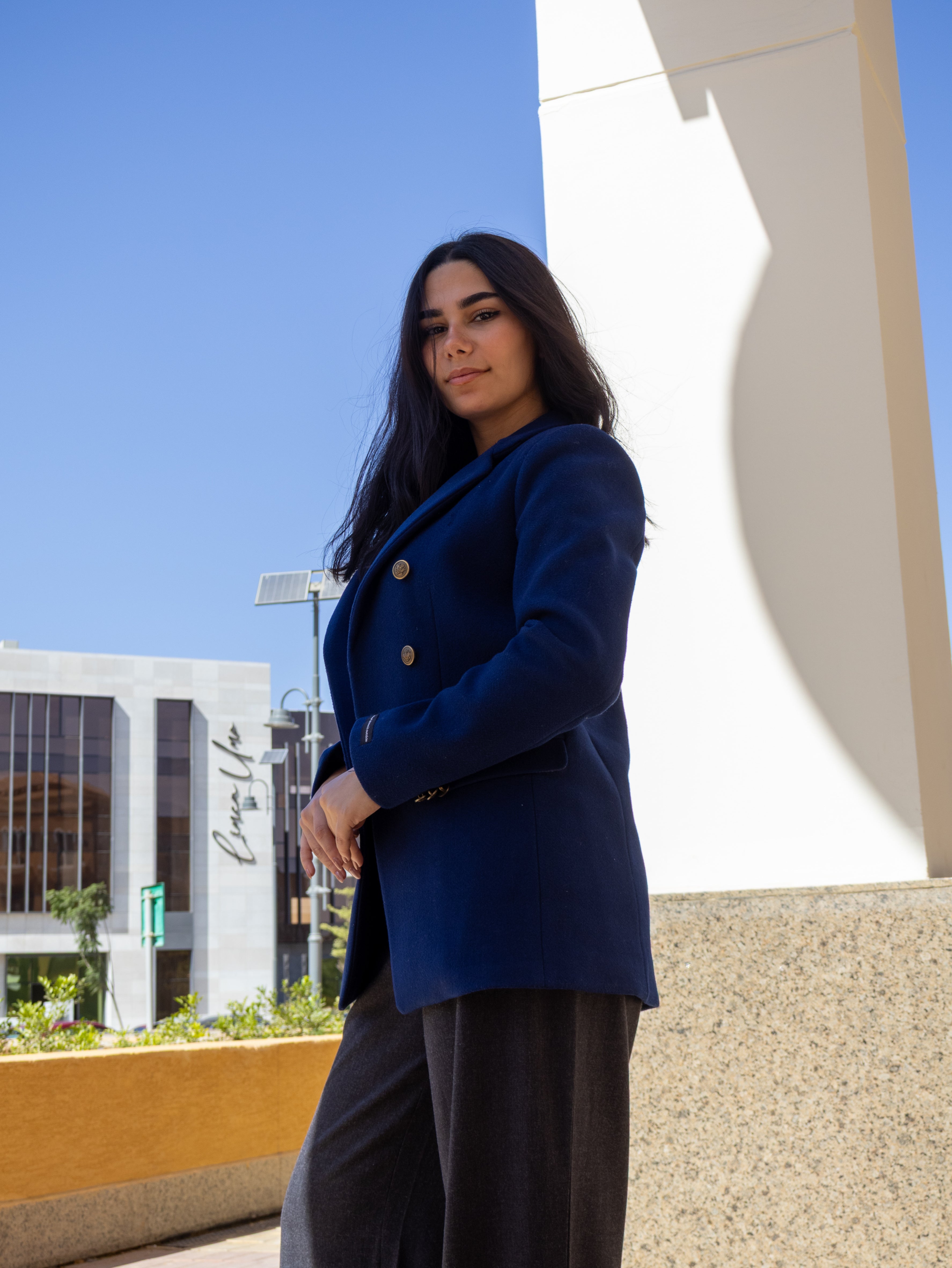 Tailored from premium wool-blend fabric, this navy blazer blends structure with softness for a timeless appeal.