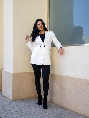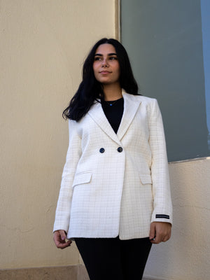 Inspired by the refined charm of classic Chanel tweed, this white blazer captures sophistication in its purest form.