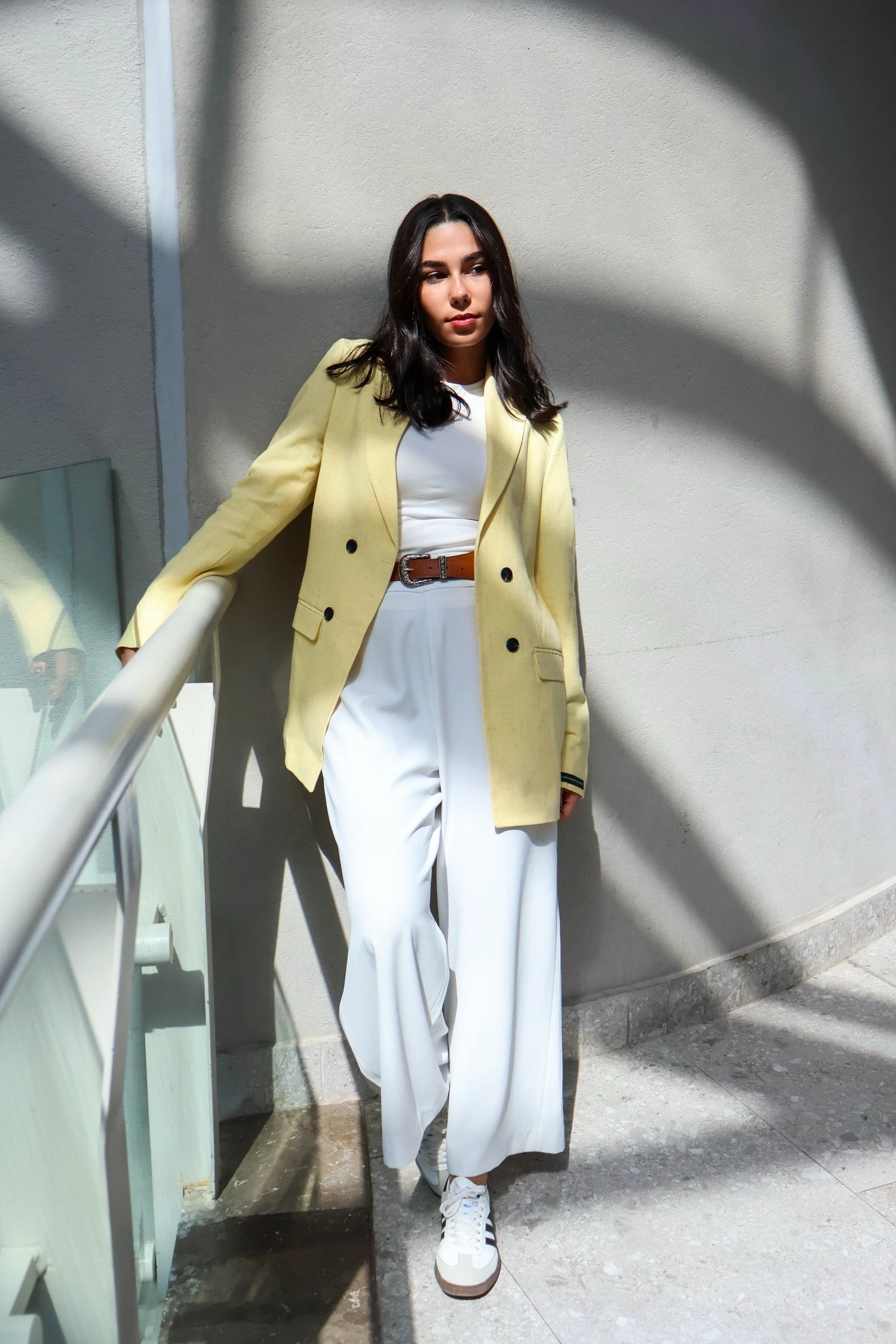 This soft yellow linen blazer adds a fresh pop of color to your wardrobe.